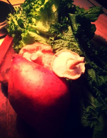 I often start my cooking adventures with a peek inside the produce box, using what eroots has to offer. This week’s gifts came in the form of shitake mushrooms, sweet potatoes, and mustard greens. A good aspirational start, I thought. From this beginning came the following recipe.