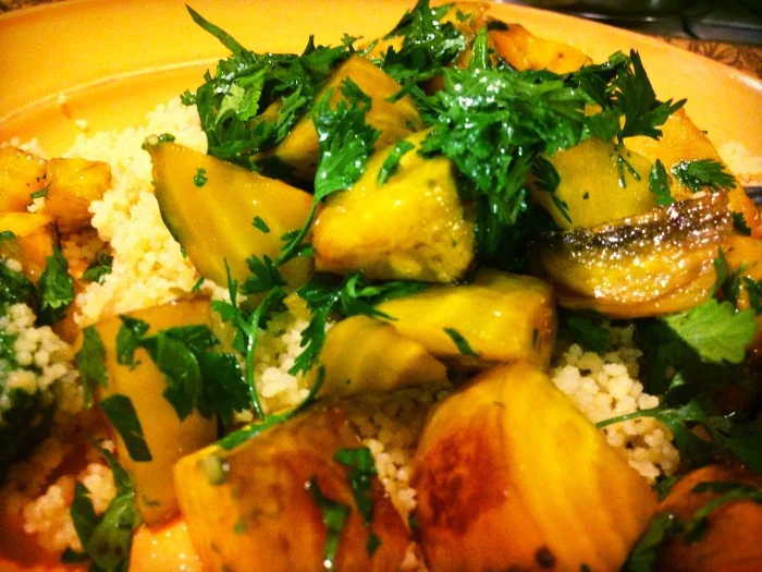 4. Serve over a bed of couscous or other yellowish grain or rice. Add some goat cheese too if you like.