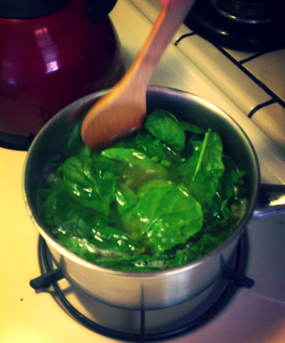 When the garlic is ready, add the stock, raise the heat a bit, and bring to a boil. Then adjust the heat to maintain a gentle simmer, and continue to cook for about 15 minutes. Add the spinach, and immediately turn off the stove.