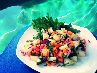 What started with grand illusions of a Moroccan lunch with tabbouleh turned into simpler fare. Red onion, parsley, cucumber, and carrots. Add a little white balsamic vinegar, just a touch of olive oil, and Hepp's citrus salt. We were out of the kitchen and back in the pool in no time.