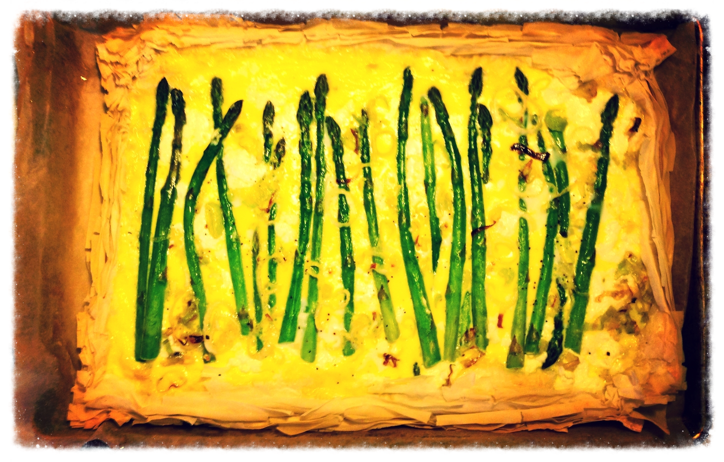 Sprinkle the goat cheese over the phyllo crust. Arrange the asparagus spears in a row evenly atop the goat cheese. Sprinkle the green garlic slices over the cheese and asparagus. With hand or spoon press the vegetables down into the cheese to flatten.